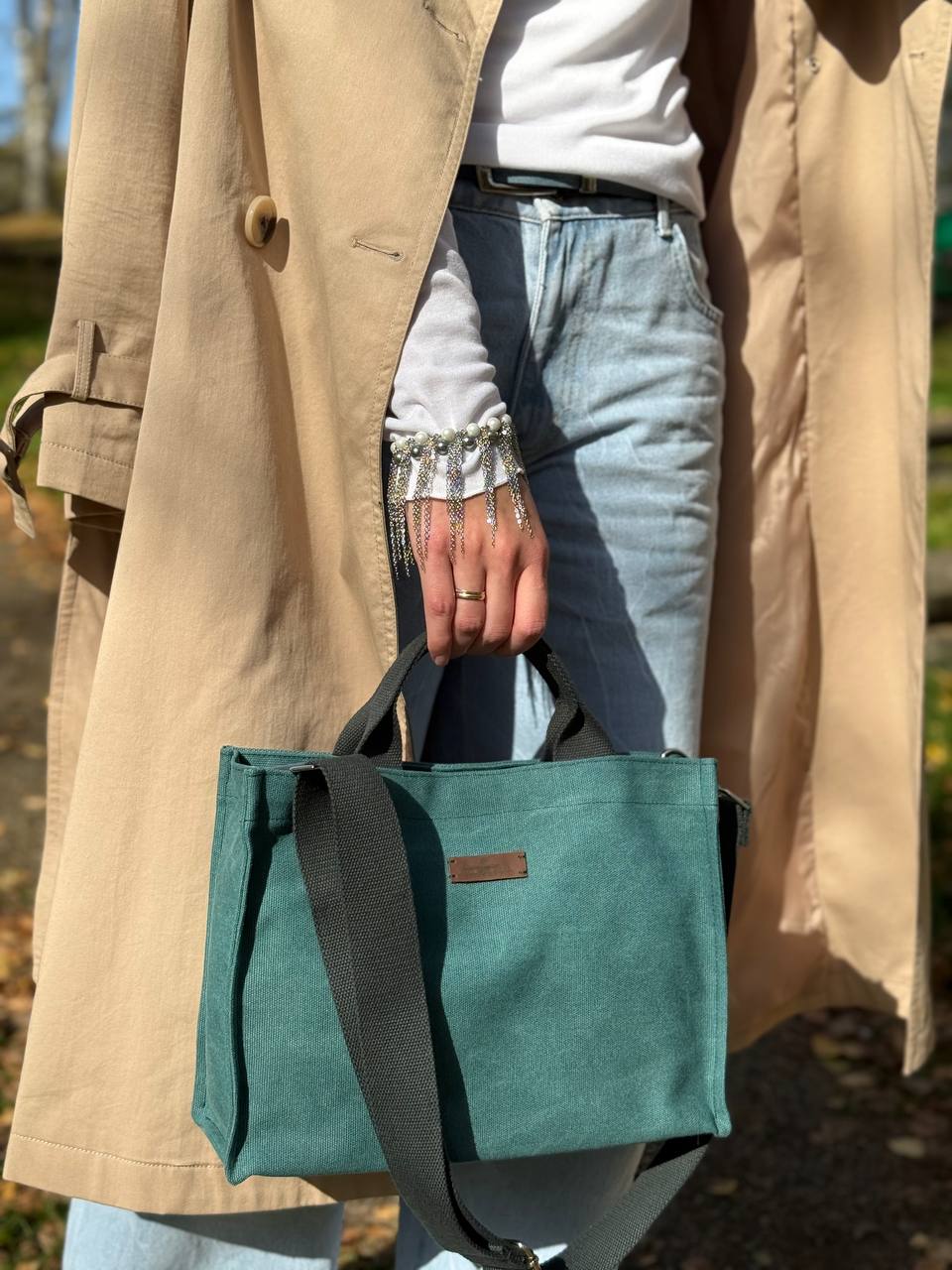 Компактная и удивительно вместительная 18 × 14 × 6 см — идеальный размер для тех, кто ценит свободу и не носит с собой лишнего. При этом помещается всё самое важное: телефон, ключи, картхолдер, помада.