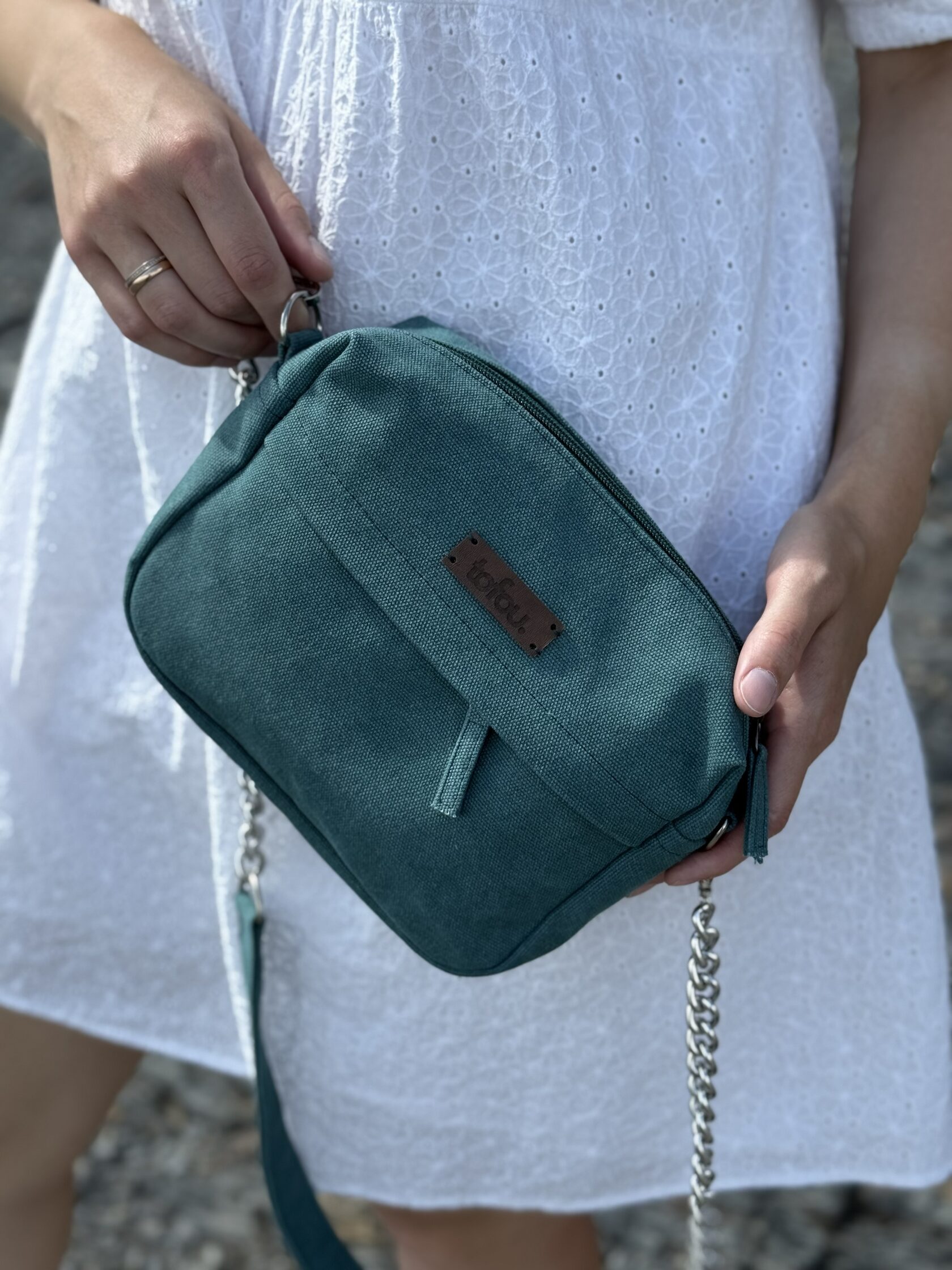 Комбинированный ремешок Длина 100 см — идеальная посадка на плече или перекрестно через корпус. Сочетание цепи и натурального канваса добавляет изюминку.